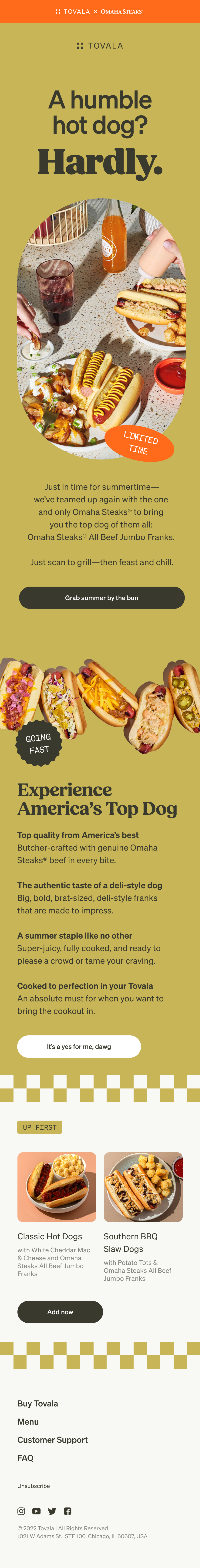 To kick off the summer season, we paired with Omaha Steaks to create a limited time menu featuring Omaha’s Beef Franks. I art directed the photoshoot for this campaign, as well as the branding for the campaign emails and social posts.